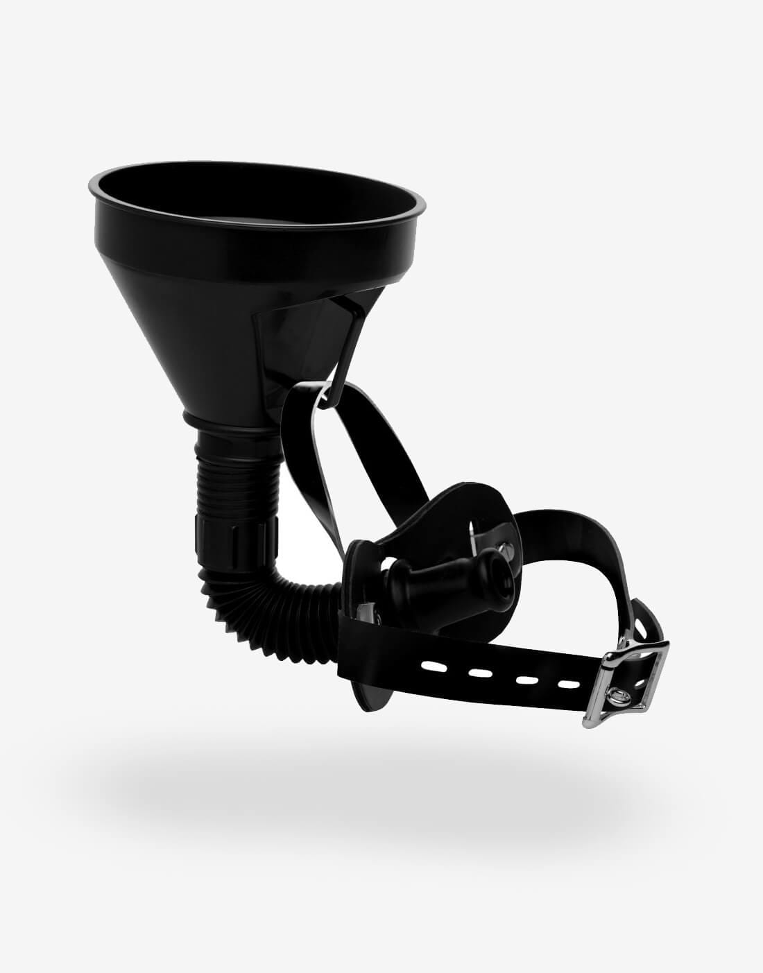 Navnet siger det hele! Hæld den valgte væske ned i din slaves hals og tving vedkommende til at sluge hver en dråbe. Denne innovative og usædvanlige gag kan tilpasses rundt om din slaves hoved og låses efter velbefindende, så slaven ikke kan undslippe dine mest fordrejede lyster. Den fleksible tragt er holdt lodret af en strap, men kan blive fjernet, så du har mere kontrol. Gør legen lidt sjovere med denne underkuende og sadistiske opfindelse.