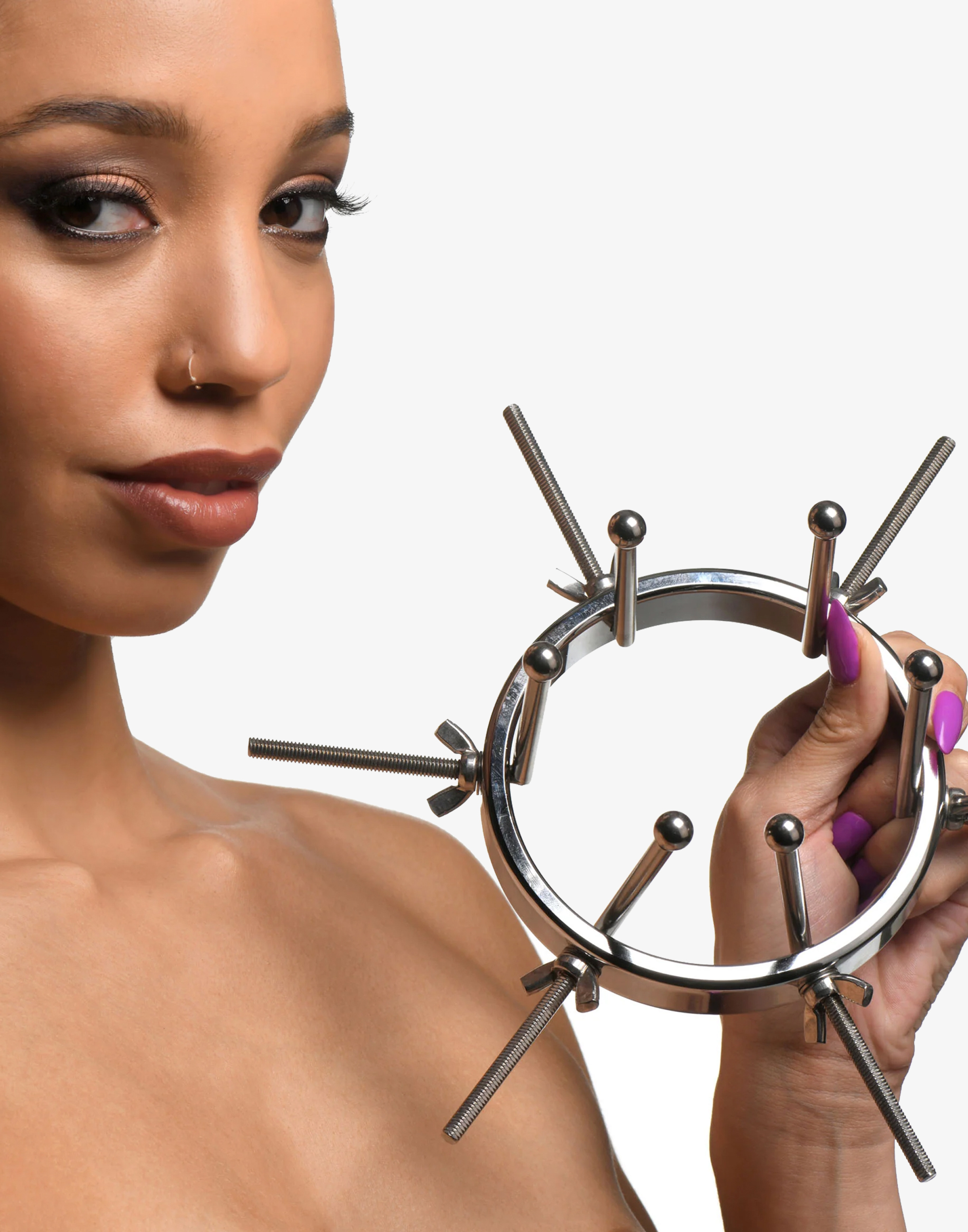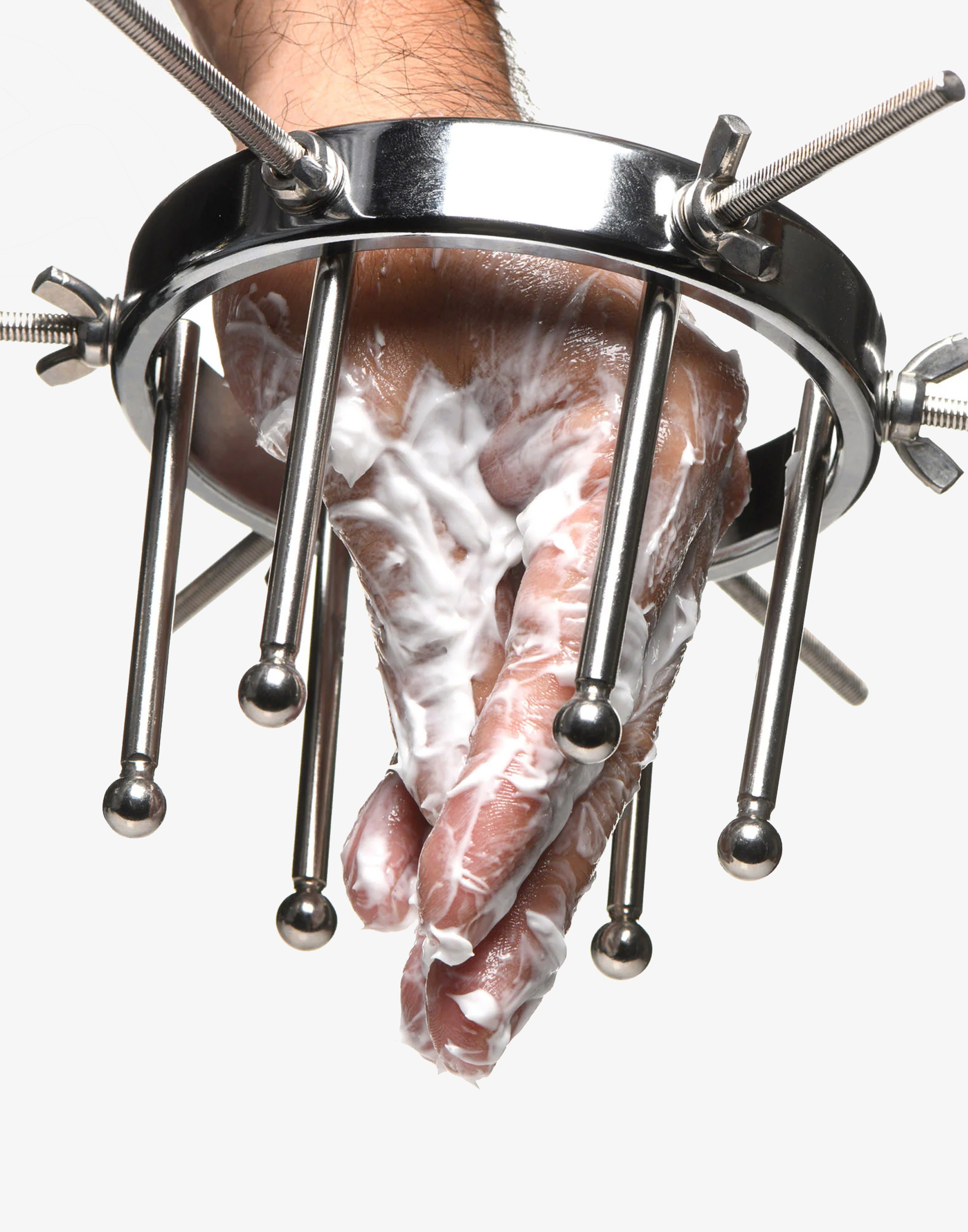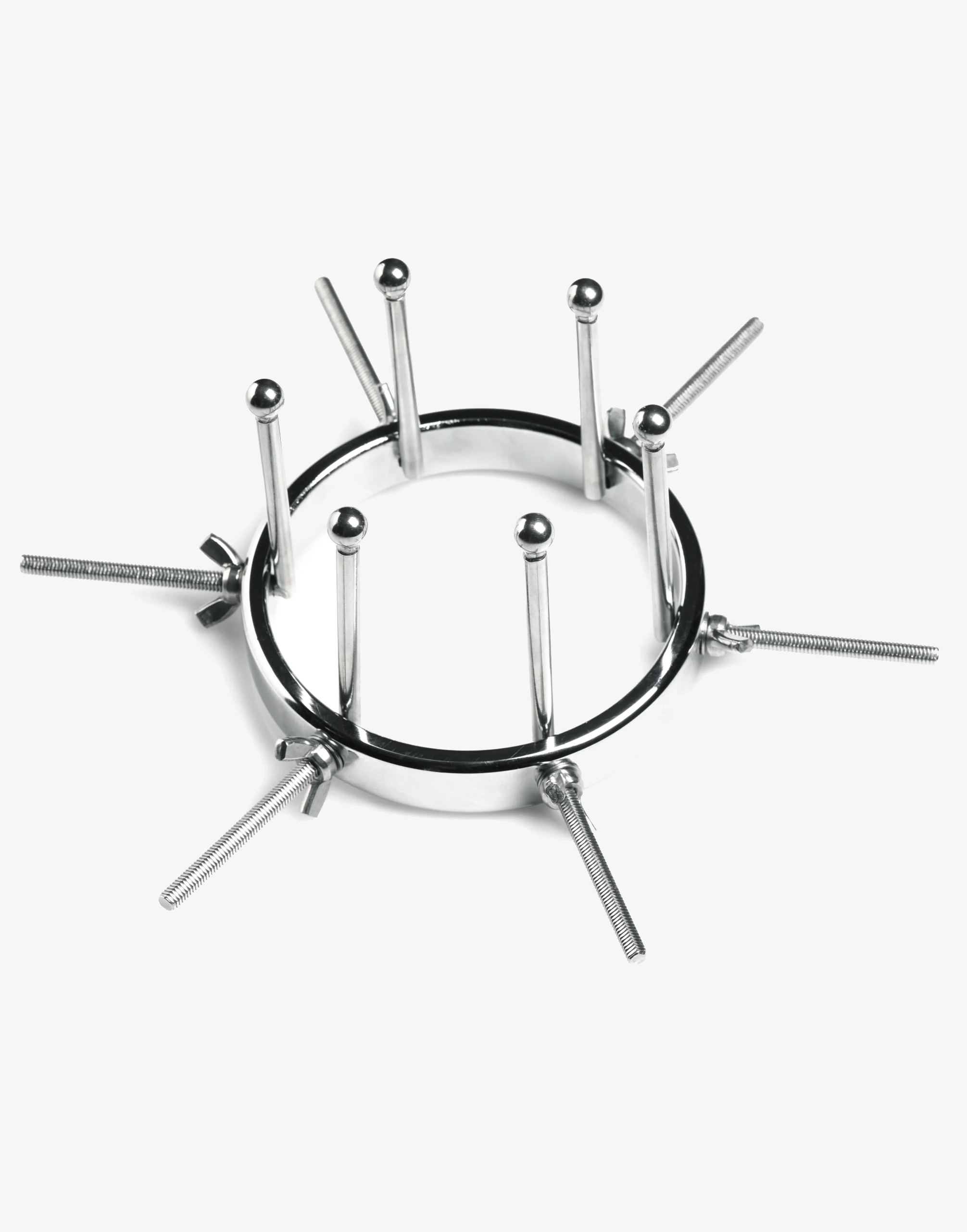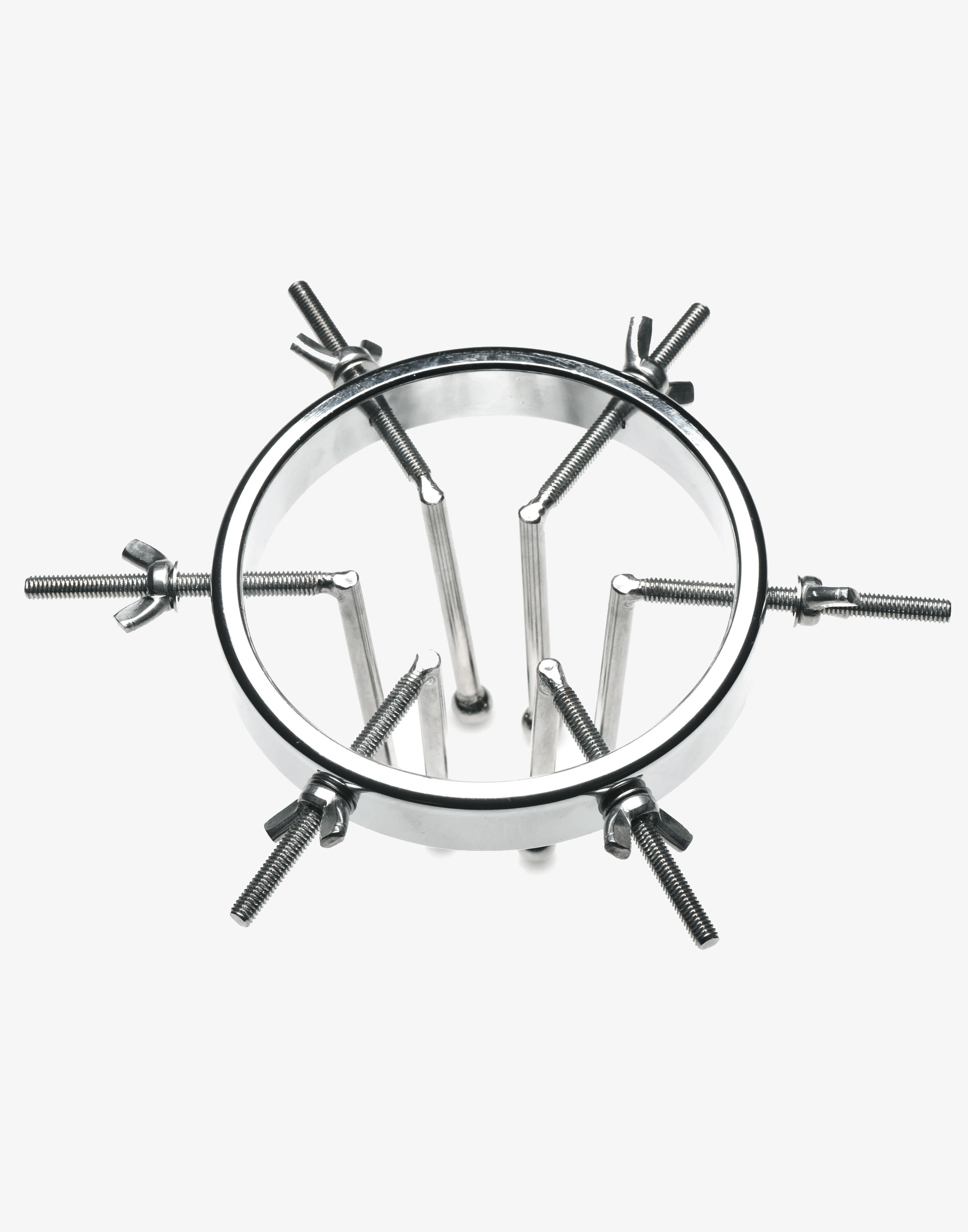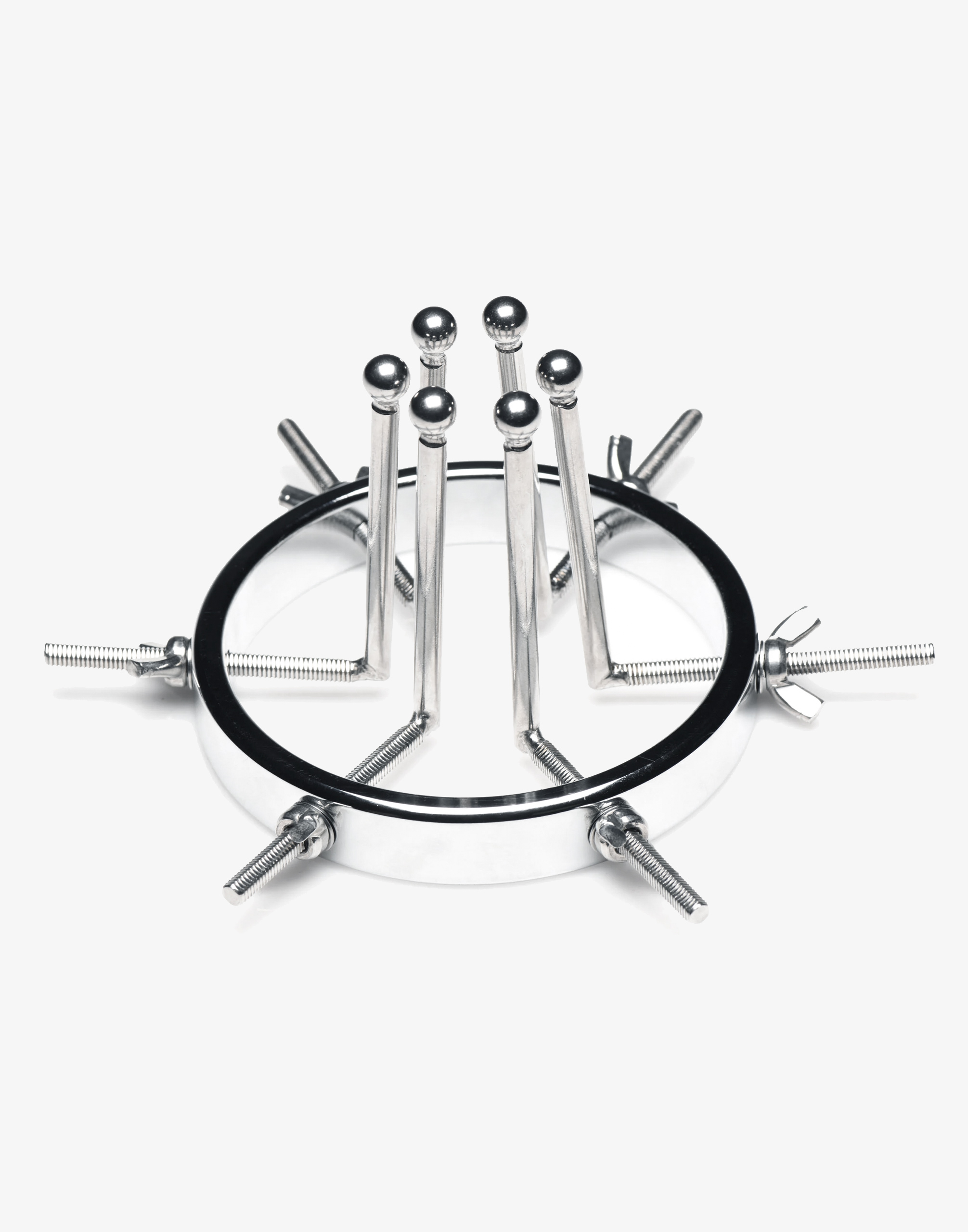 Oculus består af en stor ring med en diameter på 10 cm og 6 justerbare dilatorer. De glatte stænger med små, runde kugler i enderne giver en unik følelse og mulighed for at sprede hullet vidt åbent. Ringen er endda bred nok til at rumme en knytnæve, så du kan udforske fisting på en sikker måde. Hver dilatorstang kan justeres individuelt ved hjælp af vingemøtrikkerne, så du kan stramme eller løsne dem efter behov. Det glatte stål presser behageligt mod det følsomme væv, mens de spiralformede skruer er placeret udenfor mod balderne for maksimal komfort.