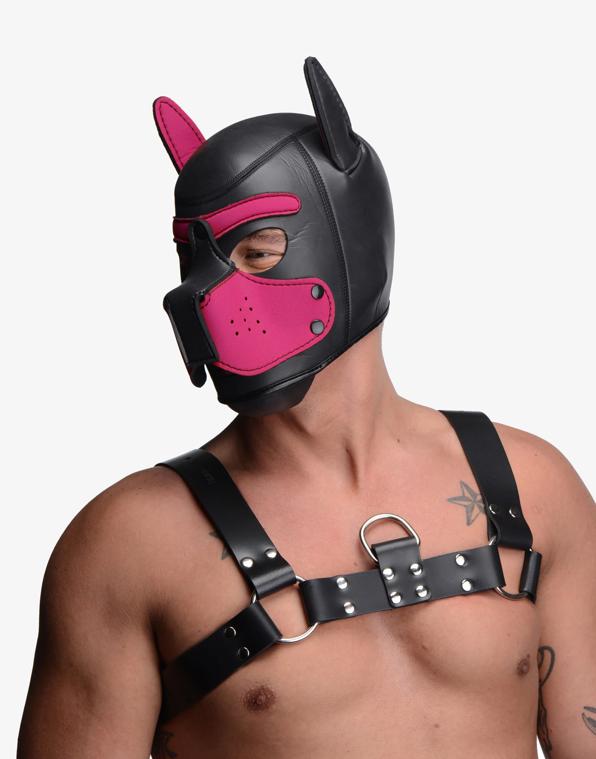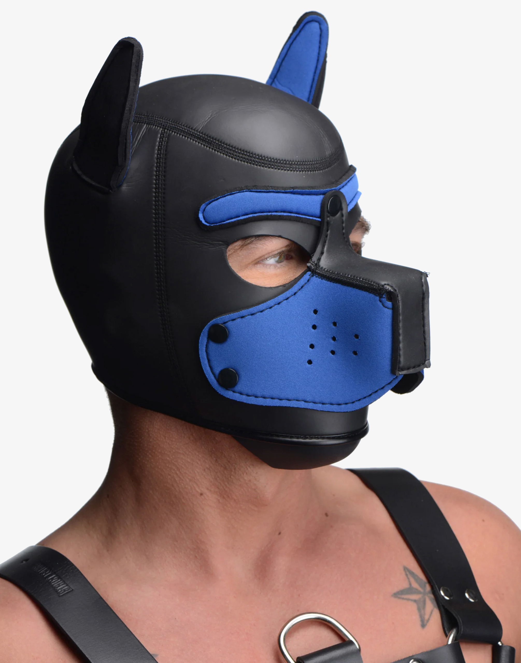 Fuld hundemaske i blød og elastisk neopren, perfekt til puppy play rollespil og andre fetishlege. Masken kan let trækkes over hovedet på vovse, så den kun kan kigge ud of trække vejret. Skal snuden og munden bruges i legen, kan du let klikke snuden af med trykknapperne, så der er  fri adgang til vand, ben, gags og kropsdele.