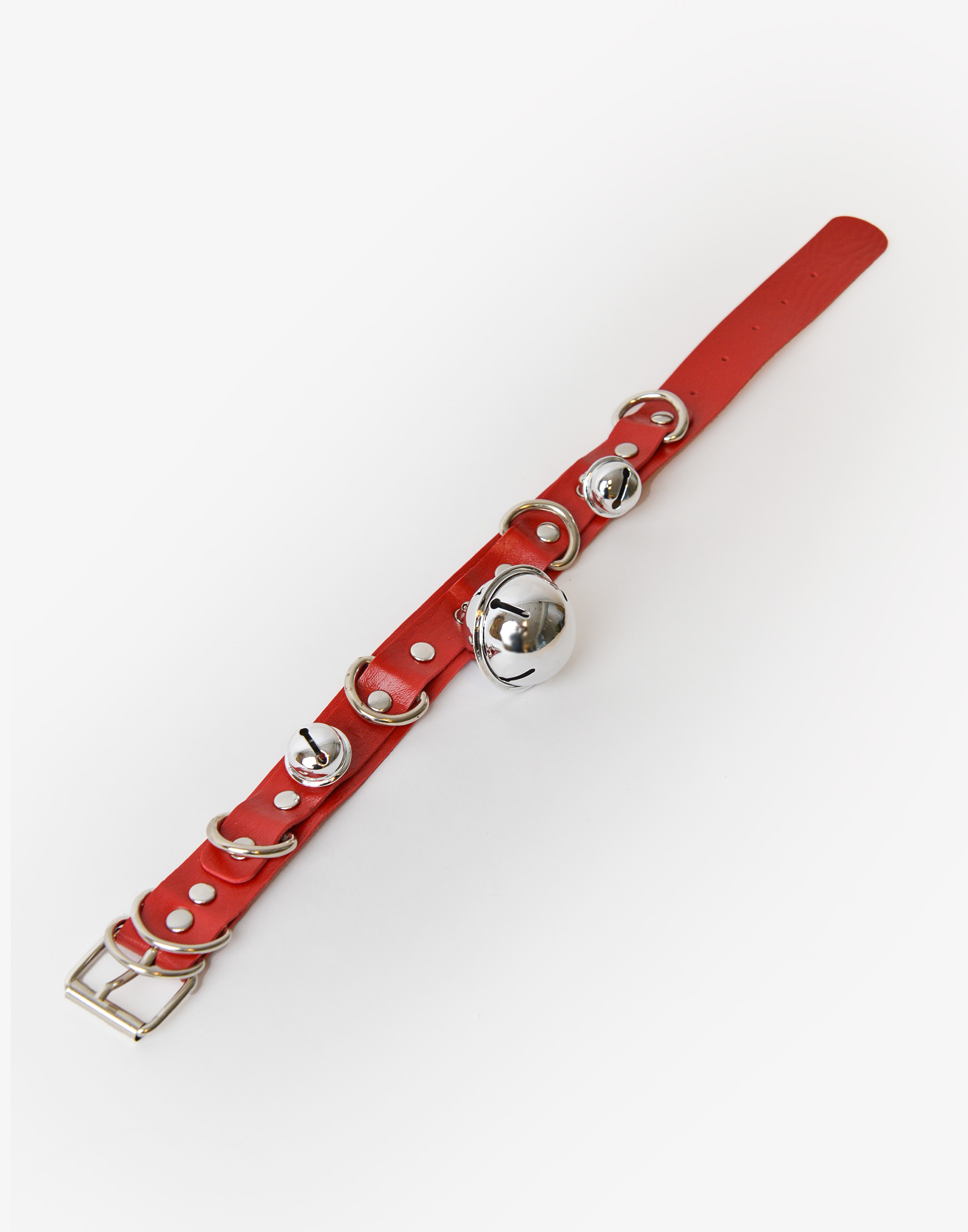 • Dette røde halsbånd i vegansk læder med klokker skaber lyd ved hver bevægelse og tilføjer spænding til dine lege.